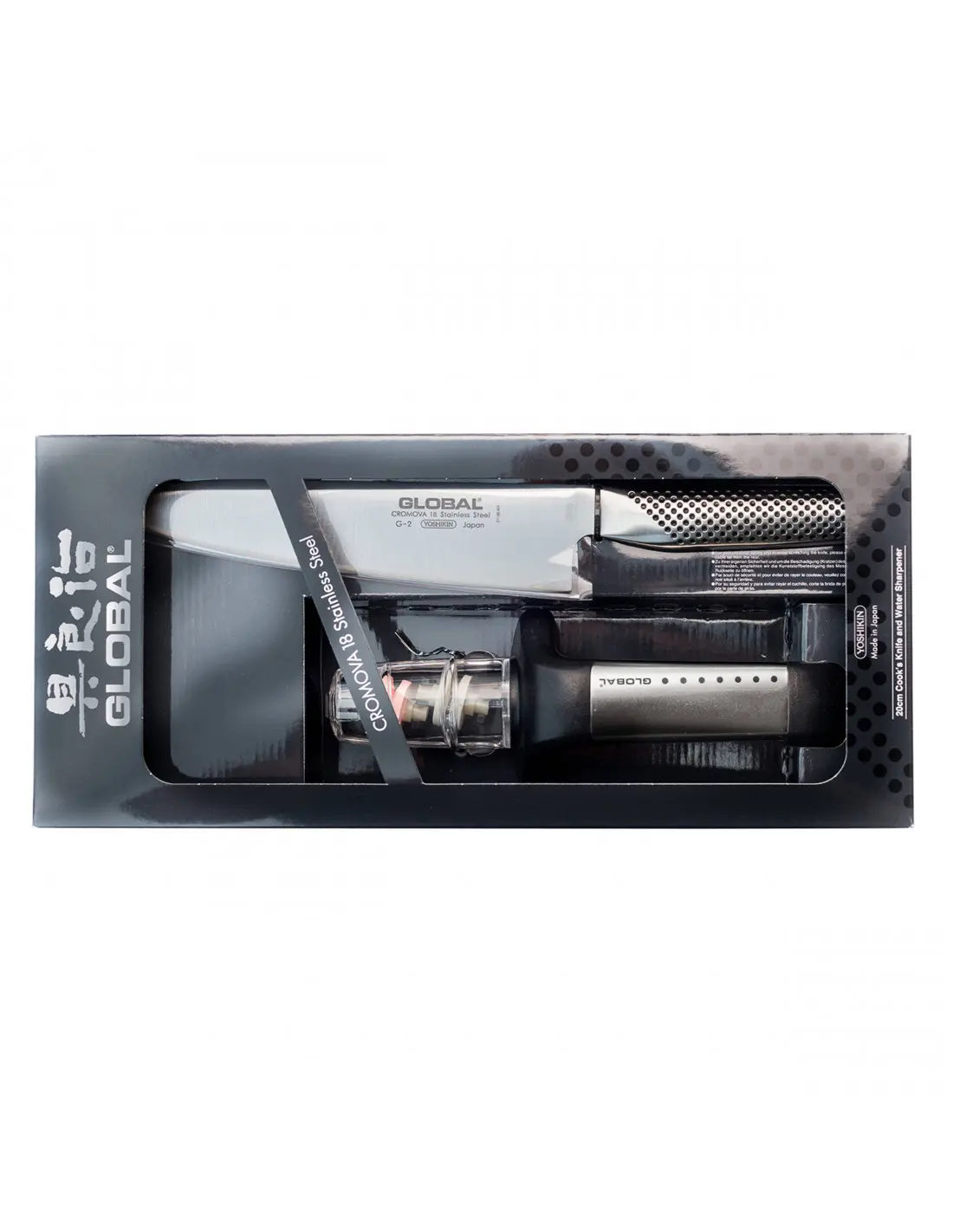 Un set din două piese care include cel mai bine vândut și versatil cuțit de bucătar G-2 (lamă netedă, 20 cm) și ascuțitorul de apă din ceramică Global, special conceput pentru a menține Global Knives în stare perfectă. Un astfel de set funcțional este, fără îndoială, un prim pas sensibil în crearea unei colecții de cuțite de bucătărie și , deoarece este ambalat într-o cutie estetică, va fi un cadou grozav pentru fiecare iubitor de artă culinară.