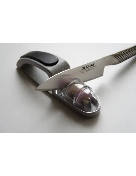 Ascuțitor ceramic cu două faze, conceput special pentru cuțitele Global și destinat ascuțirii tuturor tipurilor de cuțite, cu excepția tăieturii pe o singură față, de exemplu cuțitele tradiționale japoneze. Apa face procesul de ascuțire mai rapid, iar găurile prestabilite facilitează ascuțirea cuțitului la unghiul potrivit. Mânerul cauciucat și baza sunt anti-alunecare.