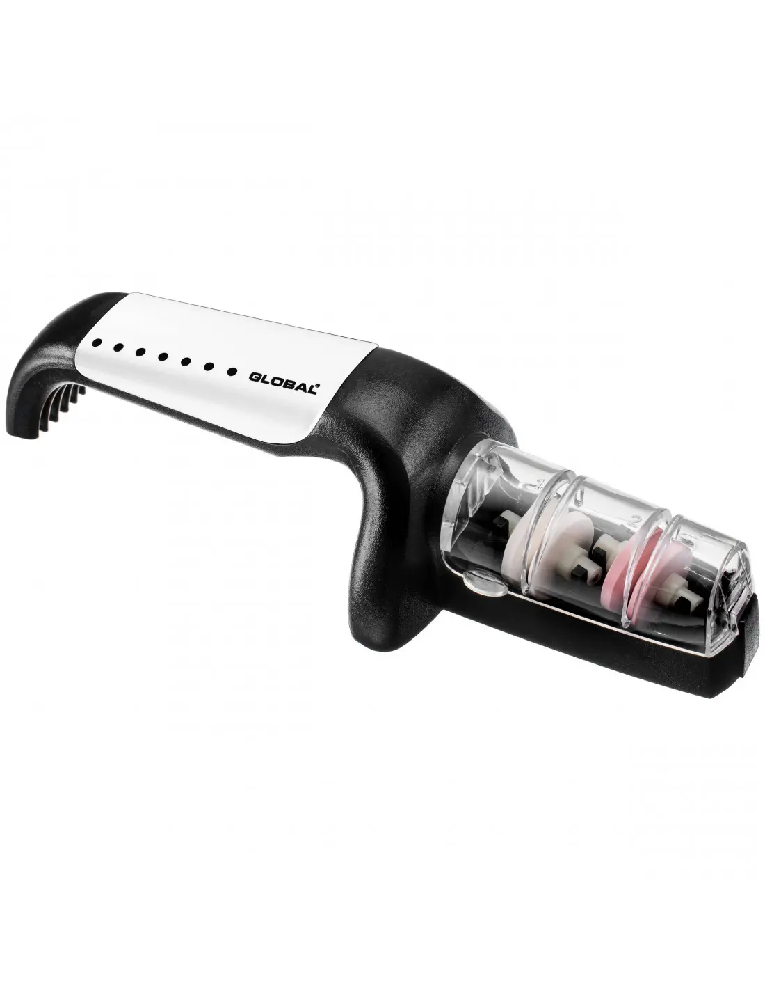 Ascuțitor ceramic cu două faze, conceput special pentru cuțitele Global și destinat ascuțirii tuturor tipurilor de cuțite, cu excepția tăieturii pe o singură față, de exemplu cuțitele tradiționale japoneze. Apa face procesul de ascuțire mai rapid, iar găurile prestabilite facilitează ascuțirea cuțitului la unghiul potrivit. Mânerul cauciucat și baza sunt anti-alunecare.