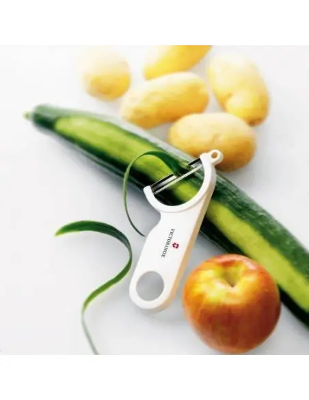Curatator cartofi Victorinox Rapid din plastic cu lama din otel inoxidabil, util la curatarea legumelor si fructelor. Culoare – Alb Material – Plastic Lama – Otel inoxidabil Greutate – 13 g Dimensiuni – 10.9 x 6.4 x 1.3 cm Poate fi curatat in masina de spalat vase